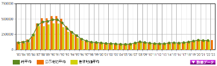参考从1983年(昭和58年)开始的40年数据,台东区公示地价的最高值是1990年的547万5200日元/平方米,最低价是2005年的89万5865日元/平方米,两者之间的差距为6.11倍。基准地价的最高值是1990年的429万3750日元/平方米,最低价是2004年的88万0576日元/平方米,两者之间的差距为4.88倍。