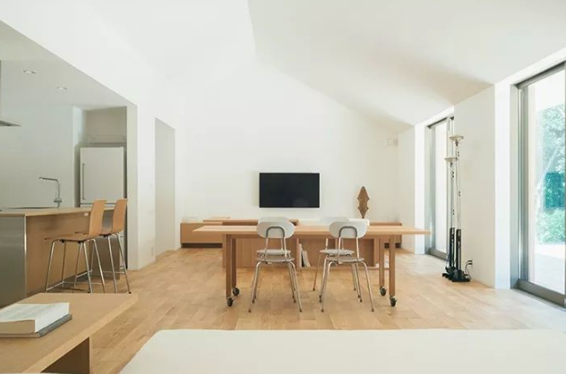 「阳之家」的内、外部都崇尚开放式的空间。屋内虽有各个功能分区,但是没有墙壁加以隔断,内部的“大开间”看着就那么通透!而且屋内充斥着“极简”风格,白墙搭配原木地板及原木家具,与外墙的原木本色相呼应。就连家具的风格也是极度简约,比如桌子或橱柜下面没有过多的隔板设计,宽敞的空间搭配MUJI的收纳物件,便于移动和根据需求不断调整,常换常新,平添生活的趣味。