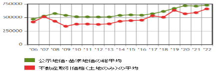 在实际进行的北区房地产交易中,国土交通省仅计算了不包括建筑物(例如大楼或房屋)的土地销售交易的平均价格。由于这些数据是来自实际房地产交易的价格,因此它们是接近市场价格的数字。北区的土地交易价格,在2022年(令和4年)第一季度中,按每平方米计算的价格为65万7857日元/平方米,按每坪计算的价格为217万4734日元/坪,与去年相比上涨了11.73%。这个平均交易价格与公示地价和基准地价的平均值相比,有一个-9.33%的差距。