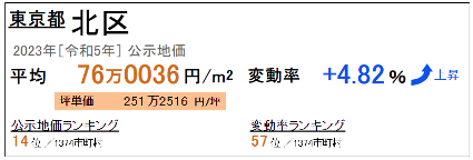 2023年(令和5年)发布的最新公示地价显示,东京都北区平均每平方米地价为76万0036日元,每坪地价平均为251万2516日元,坪价格日本全国排名第14位。地价较去年上涨4.82%,在日本全国变动率排名第57位。