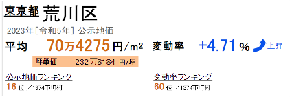 2023年(令和5年)发布的最新公示地价显示,东京都荒川区的地价为平均每平方米70万4275日元,每坪地价平均为232万8184日元,坪价格日本全国排名第16位。地价较去年上涨4.71%,在日本全国变动率排名第60位。
