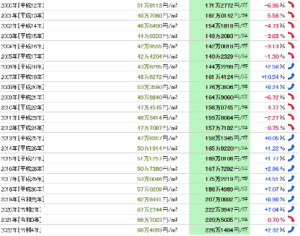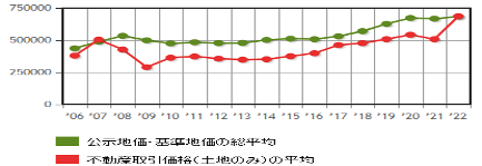 在实际进行的荒川区房地产交易中,国土交通省仅计算了不包括建筑物(例如大楼或房屋)的土地销售交易的平均价格。由于这些是来自实际房地产交易的价格,因此它们是更接近市场价格的数字。在2022年(令和4年)第一季度中,按每平方米计算的价格为68万6000日元/平方米,荒川区的土地交易价格按每坪计算为226万7768日元/坪,与去年相比上涨了35.20%。这个平均交易价格与公示地价和基准地价的平均值相比,有一个+0.28%的差距。