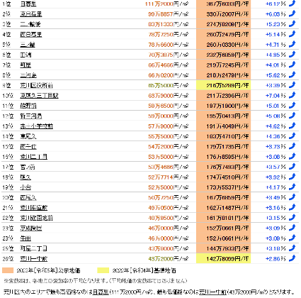 我们发布的东京都荒川区土地价格的市场行情,是基于公示地价和基准地价的标准地/基准地数据,由我们独立计算平均值和变动率,并按照东京都荒川区在全日本市区町村中的排名进行统计。
