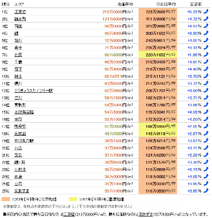 我们发布的东京都墨田区土地价格的市场行情,是基于公示地价和基准地价的标准地/基准地数据,由我们独立计算平均值和变动率,并按照东京都墨田区在全日本市区町村中的排名进行统计。