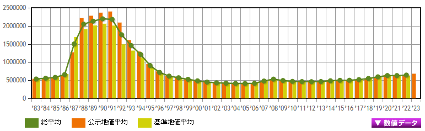 在实际进行的墨田区房地产交易中,日本国土交通省仅计算了不包括建筑物(例如大楼或房屋)的土地销售交易的平均价格。由于这些是来自实际房地产交易的价格,因此它们是更加接近市场价格的数字。在2022年(令和4年)第一季度中,墨田区的土地交易价格按每平方米计算为98万日元/平方米,按每坪计算为323万9669日元/坪,与去年相比上涨了+16.65%。这个平均交易价格与公示地价和基准地价的平均值相比,有一个+52.36%的差距。