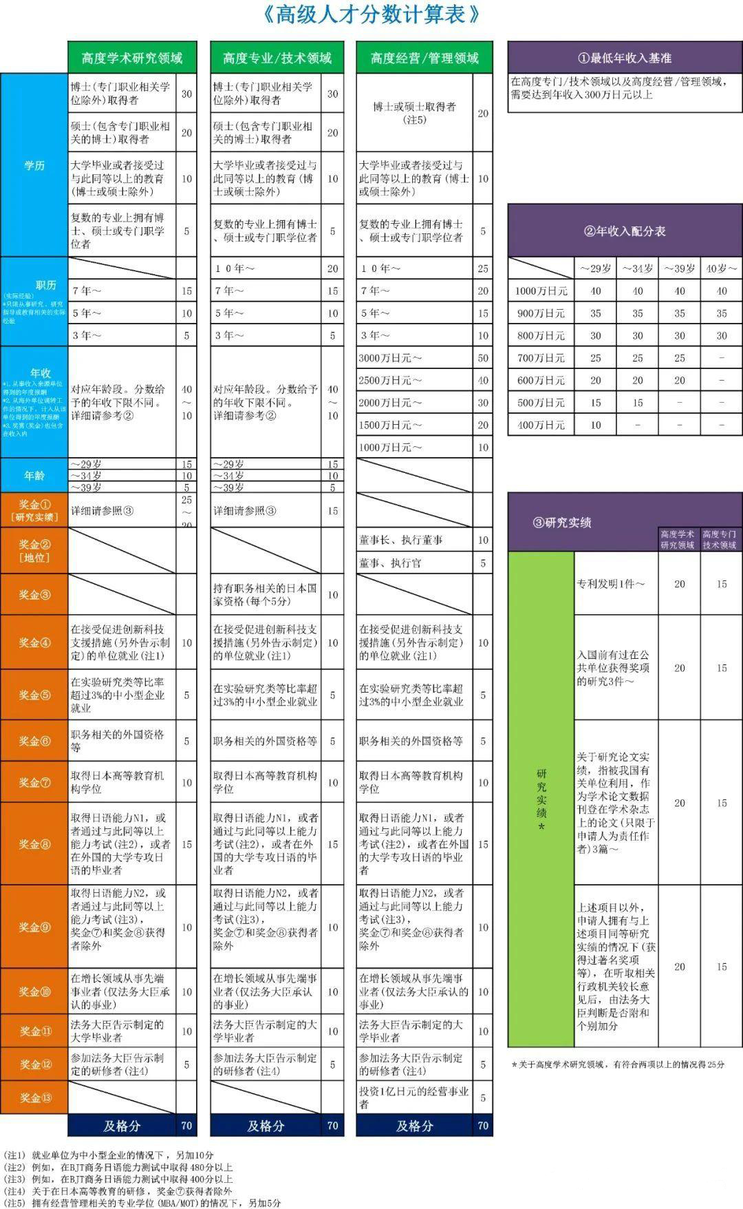 高度人才在普通的经营管理签证之上,要求更多主要是流水额和社长的个人的年收入。目前高度人才有两种方式,一个是申请人通过评分达到70分,最快3年可以申请永住;达到80分最快1年可申请永住。这个跟申请人的年龄、工作履历、毕业院校、学历、年收入等息息相关。
