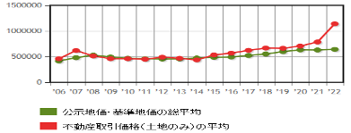 在实际进行的江东区房地产交易中,日本国土交通省仅计算了不包括建筑物(例如大楼或房屋)的土地销售交易的平均价格。由于这些是来自实际房地产交易的价格,因此它们是更加接近市场价格的数字。在2022年(令和4年)第一季度中,江东区的土地交易价格按每平方米计算为114万日元/平方米,按每坪计算为376万8595日元/坪,与去年相比上涨了+45.11%。这个平均交易价格与公示地价和基准地价的平均值相比,有一个+77.76%的差距。