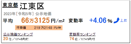 2023年(令和5年)发布的最新公示地价显示,东京都江东区的地价为平均每平方米66万3125日元,每坪地价平均为219万2148日元,坪价格日本全国排名第20位。地价较去年上涨4.06%,在日本全国变动率排名第74位。