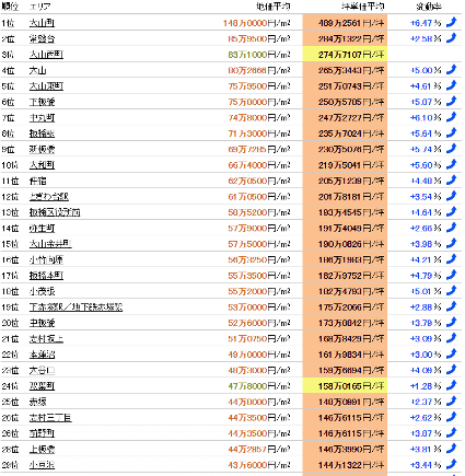 板桥区的最高价地点是「板橋区大山町31-1」(每平米148万日元),最低价地点是「板橋区新河岸2-8-25」(每平米27万日元)。