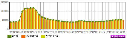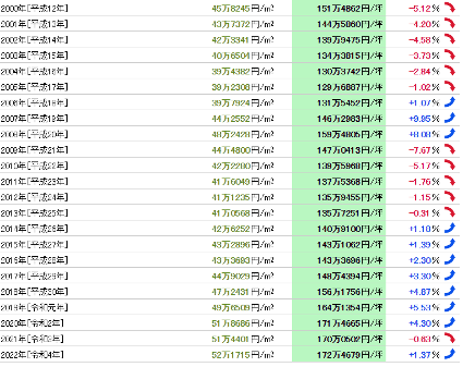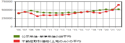 在实际进行的板桥区房地产交易中,日本国土交通省仅计算了不包括建筑物(例如大楼或房屋)的土地销售交易的平均价格。由于这些是来自实际房地产交易的价格,因此它们是接近市场价格的数字。在2022年(令和4年)第一季度中,板桥区的土地交易价格按每平方米计算为65万2666日元/平方米,按每坪计算为215万7575日元/坪,与去年相比上涨了+31.28%。这个平均交易价格与公示地价和基准地价的平均值相比,有一个+25.10%的差距。