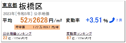 2023年(令和5年)发布的最新公示地价显示,东京都板桥区的地价为平均每平方米52万2628日元,每坪地价平均为172万7697日元,坪价格日本全国排名第22位。地价较去年上涨3.51%,在日本全国变动率排名第87位。