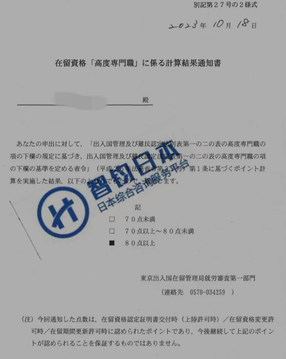 下签日:2023年10月20日 申请人T女士,希望来到日本工作。我们公司根据T女士的情况,认为她符合申请高度人才工作签证的条件。 对此,我们不断优化了T女士的相关资料,并为她量身定制了身份计划。根据她的个人条件,为她找到了适合的公司,并拿到了80分的高度人才工作签证,一年后就可以申请永住签证,恭喜T女士!