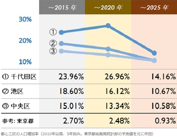 在日本总体人口数量自2010年开始持续下滑的情况下,日本的人口却开始从郊区向市中心回归了。从东京23区统计数据看来,人口回流的趋势至少将持续到2030年,“千代田区”、“港区”、“中央区”的都心三区,预计到2045年人口仍将继续增加。其中,“千代田区”的人口增加率是在23区中最出类拔萃的。随着日本经济的回暖,失业率的降低,为了更加有的地利用时间,双职工夫妇更希望住在通勤便利、各种设施齐全的市中心,“住职相近”逐渐成为了趋势。