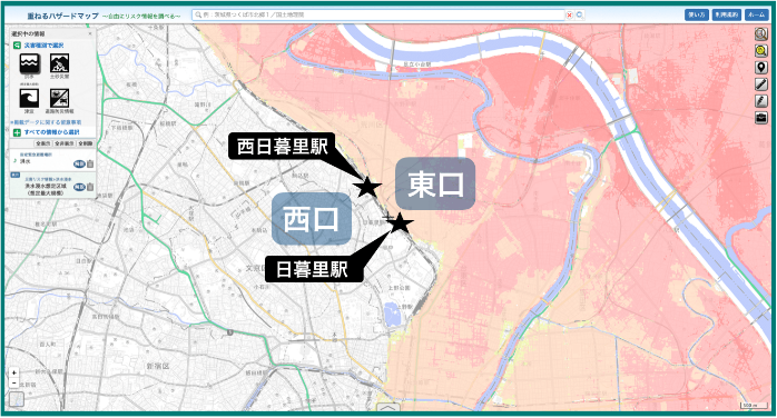 其次,据说西日暮里站的东边离荒川河道较近,地势相对较低,如果遭遇大的台风等自然灾害时,可能会有浸水的风险,所以选择居住地点时尽量选择车站西边的区域。