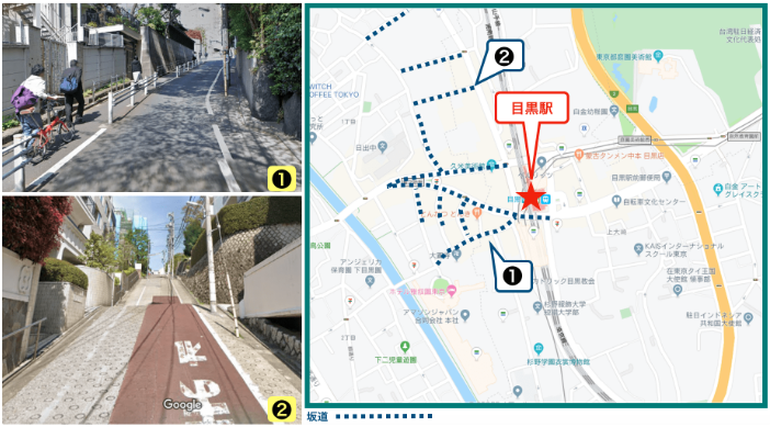 目黑站西口方向有很多陡坡,其中还有几个连骑自行车都可能骑不上去的斜坡。另外,有些地方道路狭窄,汽车通过也不容易,所以对于推婴儿车的人和老年人来说,可能会成为出行不太方便的区域。因此,住在目黑西口区域的时候,也要考虑坡道的因素。