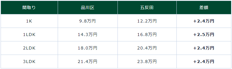 如上表所示,无论什么样的户型,五反田站周边的房租行情都比平均房租贵了2万日元以上。如果租金预算宽裕的话,可以考虑住在这里。