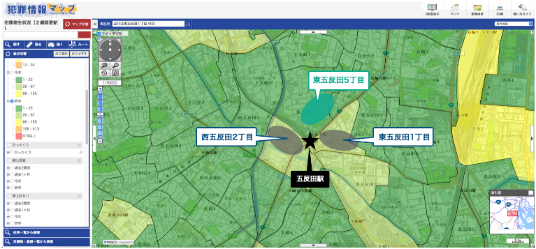 由于五反田车站附近的建筑较多,车站周边的治安稍差。以下地图是警视厅发布的“犯罪信息地图”,在车站一周的区域常有治安事件发生。