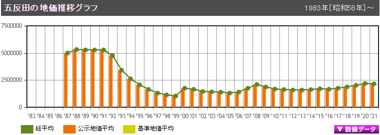 五反田2021年公示的基准地价为每平方米216.5333万日元。由于车站附近商业地块较多,新建住宅用地较少。因受到新冠肺炎疫情的影响,地价约有1.13%的下跌。