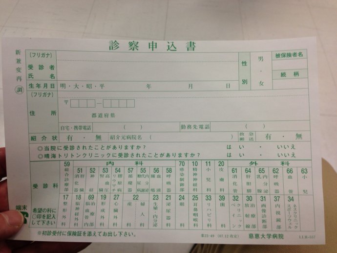 因为这是山爸第一次在日本医院就医,需要先填写一张医院的个人信息情况表,基本上就是类似姓名、住址之类的常规信息,在翻译软件和工作人员的帮助下,表格很快被中文和英文混搭着填满。随后山爸又在工作人员的引导下“挂号”,然后在公共区等待就医。