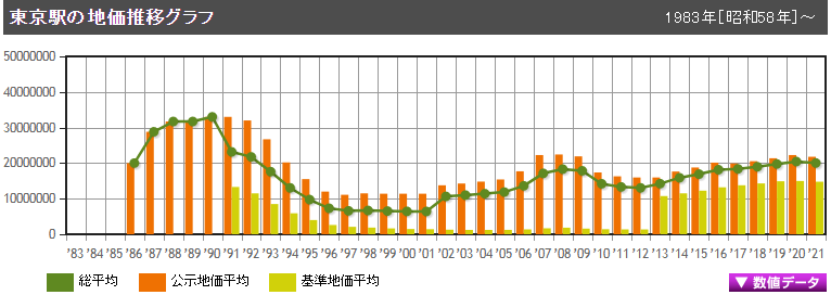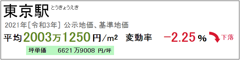 东京站2021年3月公示的基准地价为每平方米2003.125万日元,近年来地价持续上升,因受疫情的影响略有下降。