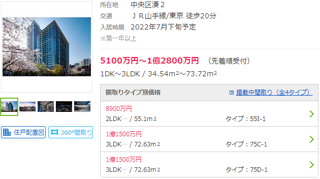 东京站附近的新建公寓项目房源较少,目前距车站步行20分钟,面积为34.54㎡-73.72㎡的1DK-3LDK户型售价为5100万-1亿2800万日元,暂定2022年7月入住。