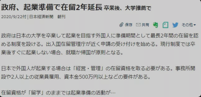 日本政府为了留住海外人才,在今年9月份出台了新政策,将为大学毕业后有意在日本创业的留学生提供最长可滞留2年的签证。希望有志青年在毕业后,没有进入企业就职的时候可以有合法的身份留在日本继续生活。