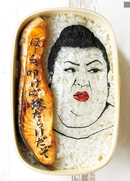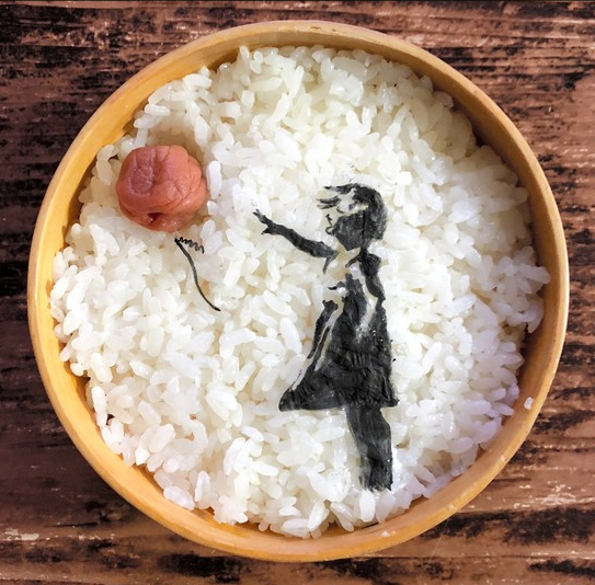亲自动手制作艺术便当的是广岛县东广岛市的设计师松浦美喜(56岁),她每天都会为丈夫和儿子制作便当。自2017年其儿子步入社会就职后,松浦美喜的时间和经济方面就都宽裕了起来。从这时起,她就开始在Instagram上发布时尚便当的照片,最开始制作的是英国匿名艺术家班克西(Banksy)的作品,其中的红色气球用梅干来表现,少女则是将食用炭溶于水后用笔画在糯米纸上,糯米纸在大米的蒸气下自然溶化而形成的。