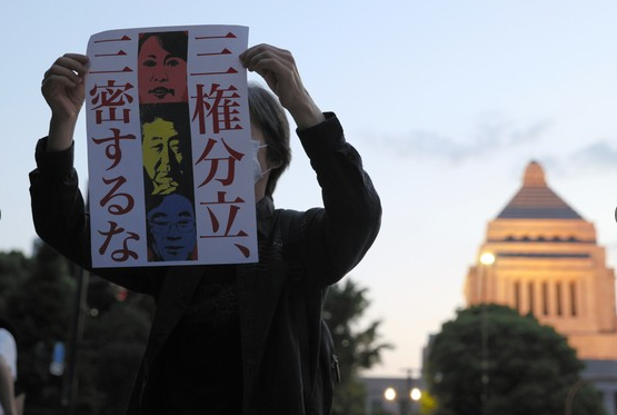 对于安倍首相将强行通过《检察厅法》修正案草案,5月13日晚在国会前发生了抗议示威活动。在抗议示威活动中,举办者呼吁人们空出2米以上的距离,参加者为了防止感染新冠肺炎病毒,均佩戴着口罩,且并未发出声音,只是静静地举着写有“停止强行表决”、“趁火打劫”等字样的纸或纸板。