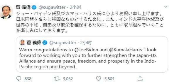 日本首相菅义伟已于11月8日早晨在推特上发布贺词,祝贺在2020美国大选中,民主党前副总统约瑟夫·拜登当选美国第46任总统。