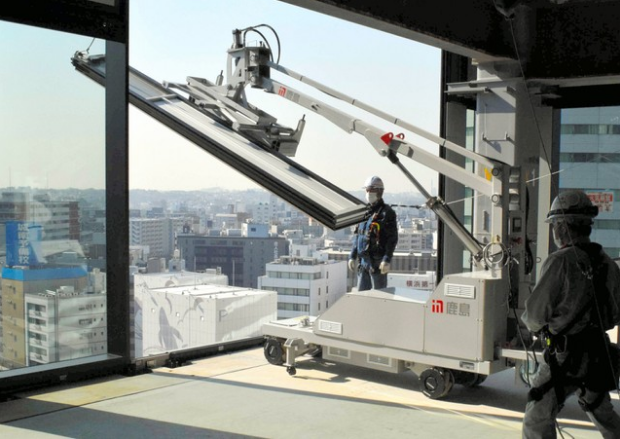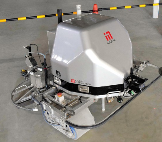 在施工现场可以看到,外壁安装正在由2名工作人员通过操控机器人进行。与以往从屋顶使用起重机进行架设的传统作业方式相比,使用机器人可以节约人手及施工时间。此外鹿岛建设还一并公开了能自动打磨地板混凝土等施工项目的机器人。