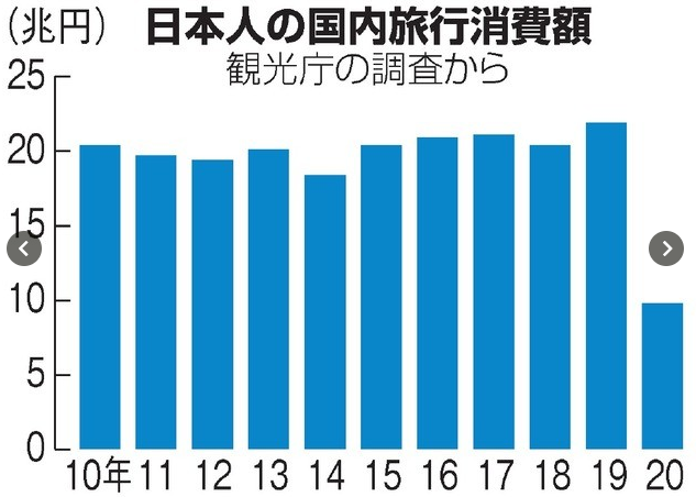 日本国内旅行消费额,在2014年由于受消费税增税影响,收入18兆4000日元(约合1.12万亿元人民币)之后,连续5年超过了20兆日元(约合1.22万亿元人民币),2019年达到21兆9000日元(约合1.33万亿元人民币),创历史新高。然而受疫情影响旅行需求低迷,形势急转直下,目前已跌至峰值的一半以下。