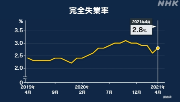 根据统计数据表示,今年4月日本全国的完全失业率为2.8%,环比上涨了0.2个百分点。完全失业率虽然连续4个月停留在2%至2.9%的水平,但日本总务省分析认为:“新冠疫情尚未结束,其所造成的影响依然存在,现阶段还很难判断就业形势是否处于好转状态。”