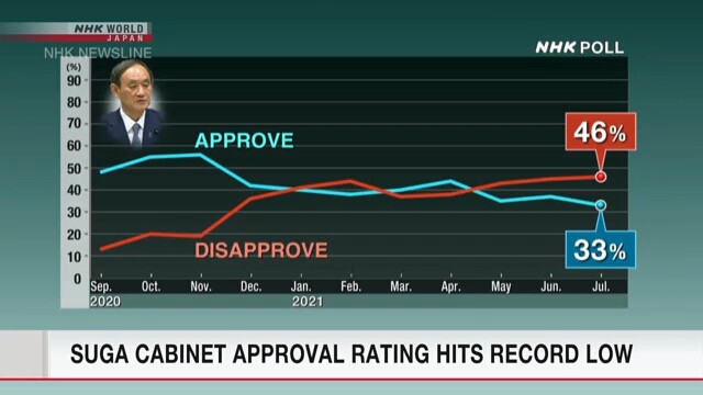 关于是否支持菅义伟内阁这一提问,表示“支持”的人较6月减少4个百分点,占比为33%,创下去年9月菅义伟内阁成立以来的新低;表示“不支持”的人增加1个百分点,占比为46%,创下菅义伟内阁成立以来的新高。