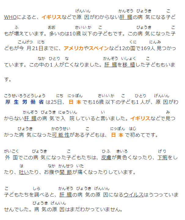 WHOによると、イギリスなどで原因がわからない肝臓の病気になる子どもが増えています。多いのは10歳以下の子どもです。この病気になった子どもが今月21日までに、アメリカやスペインなど12の国で169人見つかっています。この中の1人が亡くなりました。肝臓を移植した子どももいます。