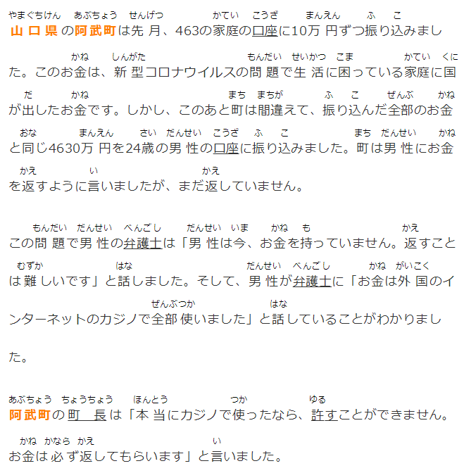 山口県の阿武町は先月、463の家庭の口座に10万円ずつ振り込みました。このお金は、新型コロナウイルスの問題で生活に困っている家庭に国が出したお金です。しかし、このあと町は間違えて、振り込んだ全部のお金と同じ4630万円を24歳の男性の口座に振り込みました。町は男性にお金を返すように言いましたが、まだ返していません。
