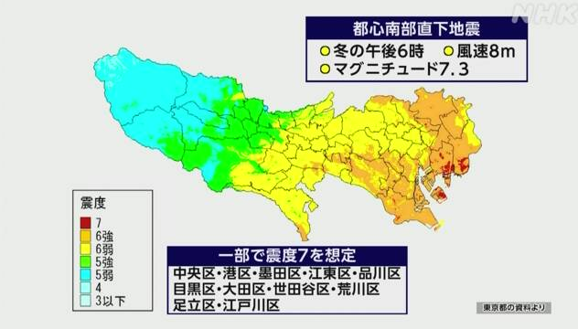 いちばん大きな被害が出るのは、冬の午後6時、風速8mのときに、マグニチュード7.3の地震が起こる場合です。江東区や江戸川区など11の区では、震度7の大きな揺れになる所があります。23区の60%ぐらいの所では、震度6強より大きな揺れがあります。