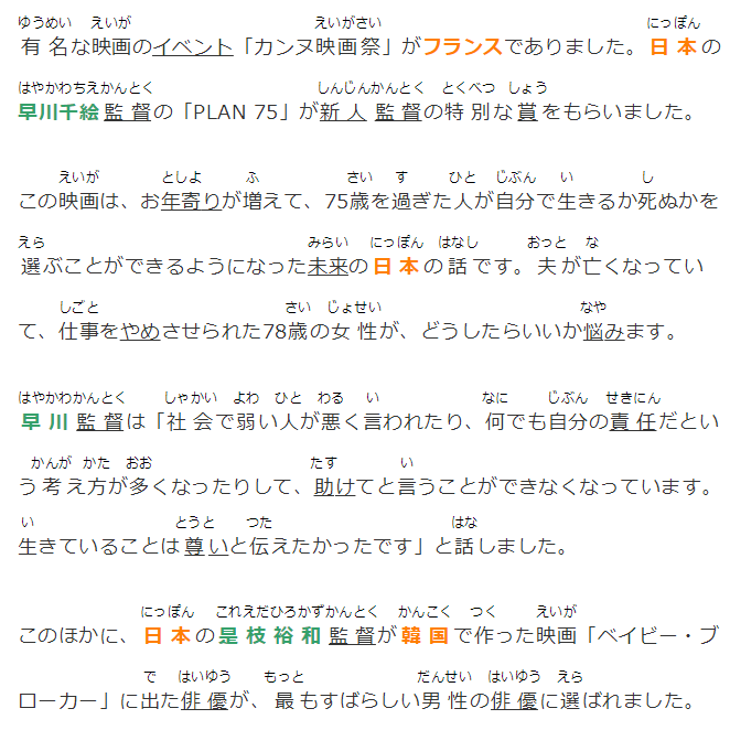 有名な映画のイベント「カンヌ映画祭」がフランスでありました。日本の早川千絵監督の「PLAN 75」が新人監督の特別な賞をもらいました。