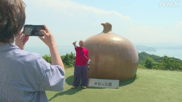 在南淡路市“涡之丘大鸣门桥纪念馆”,游客有机会与洋葱这一淡路岛特产进行各种各样的近距离接触。除了可以跟巨大的洋葱模型拍照以外,还可以玩把娃娃换成洋葱来抓的“抓洋葱机”,此外,游客还可以购买洋葱做的汤和零食等享用,其中最具人气的当属刚刚收获的四种新鲜洋葱。人们站在货架前,拿起一袋袋洋葱,比较着大小和价格。