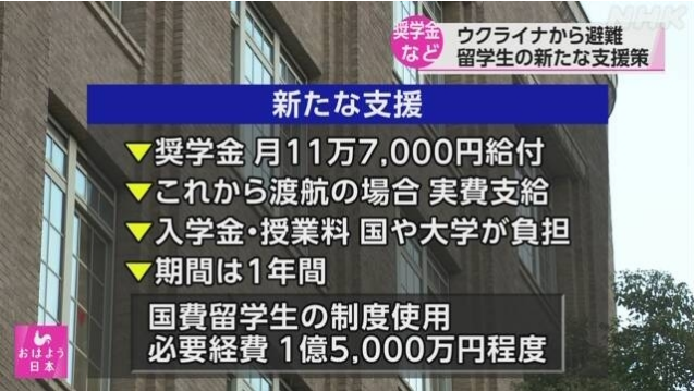俄罗斯和乌克兰的军事冲突仍在持续,在此情况下,日本文部科学省决定,在今年2月后入境日本及今后计划留学日本的乌克兰学生中,以获得大学或使馆等推荐的人员为对象,启动新一轮的支援项目。具体内容包括,除每月11万7000日元的奖学金以外,对于即将赴日的学生,还将对机票和旅费等提供全额补助,入学金及学费也将由政府和大学负担,援助时间为一年。
