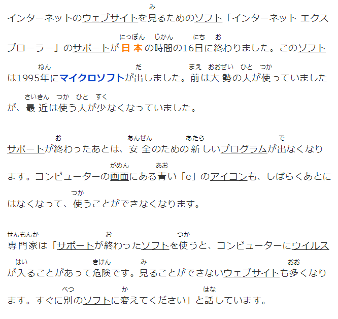 専門家は「サポートが終わったソフトを使うと、コンピューターにウイルスが入ることがあって危険です。見ることができないウェブサイトも多くなります。すぐに別のソフトに変えてください」と話しています。