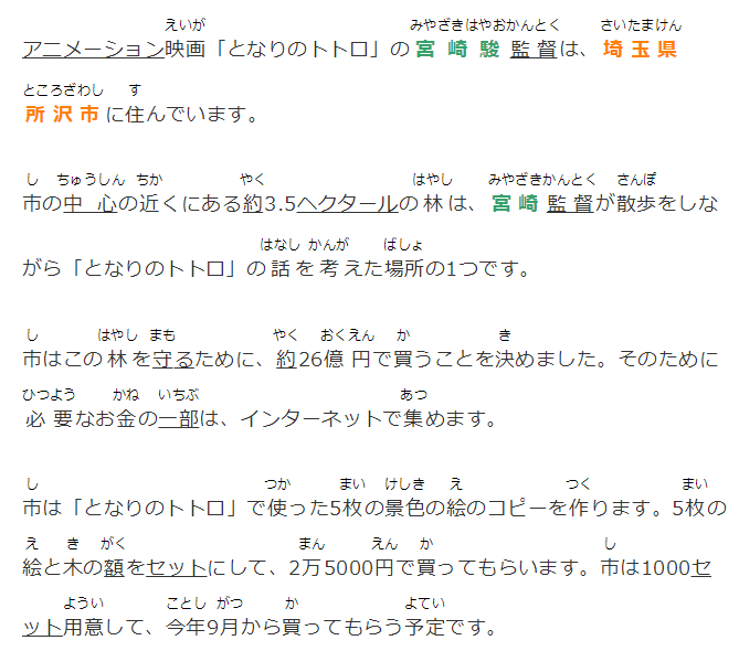 市は「となりのトトロ」で使った5枚の景色の絵のコピーを作ります。5枚の絵と木の額をセットにして、2万5000円で買ってもらいます。市は1000セット用意して、今年9月から買ってもらう予定です。