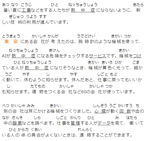 東京にある会社が考えたのは、腕時計のような機械を使って、AIが熱中症になる危険をチェックするサービスです。機械をつけている人が熱中症になりそうなとき、機械が黄色く光って、細かく動いて、休むように知らせます。休んだあと、仕事に戻ってもいいかも知らせます。建物をつくる会社など60の会社が使っています。