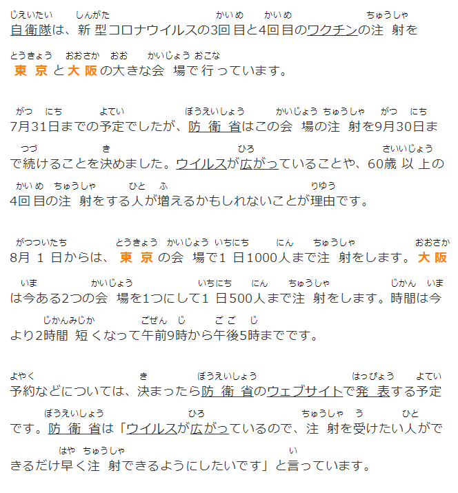 予約などについては、決まったら防衛省のウェブサイトで発表する予定です。防衛省は「ウイルスが広がっているので、注射を受けたい人ができるだけ早く注射できるようにしたいです」と言っています。