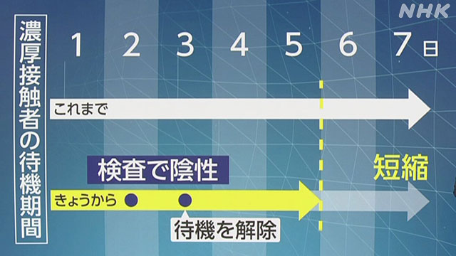 その結果、社会経済活動を維持していくため、22日から濃厚接触者に求める自宅などでの待機期間をこれまでの原則7日間から5日間に短縮し、さらに2日目と3日目の抗原検査が陰性であれば、3日目に待機を解除できることを決めました。
