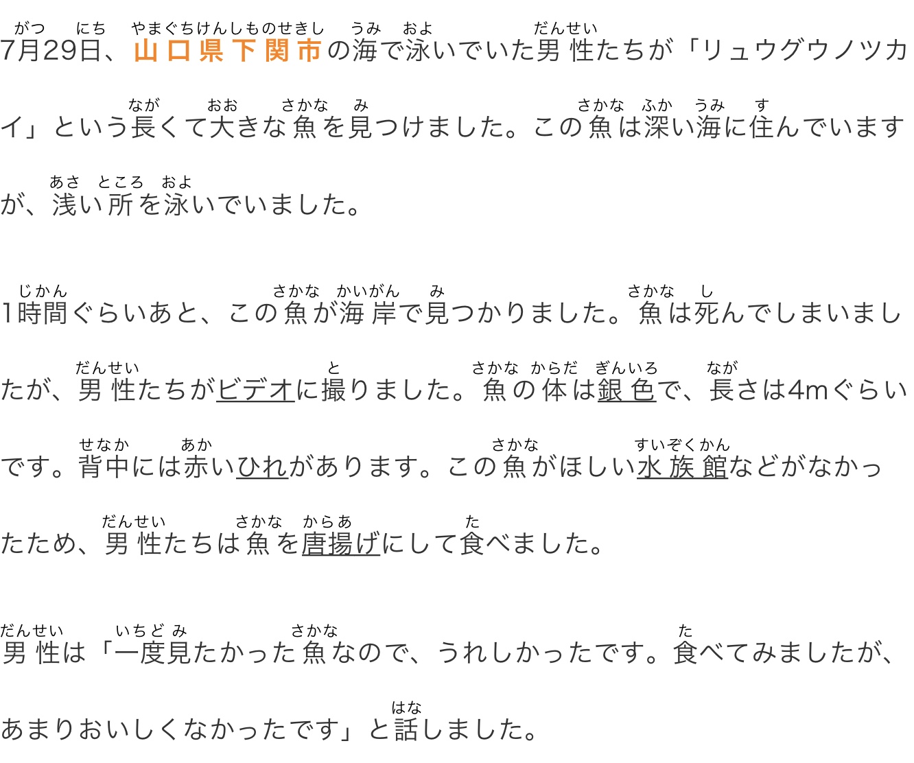 7月29日、山口県下関市の海で泳いでいた男性たちが「リュウグウノツカイ」という長くて大きな魚を見つけました。この魚は深い海に住んでいますが、浅い所を泳いでいました。