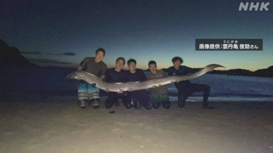 7月29日,山口县下关市水产大学的学生云丹龟俊助等一行5人在下关市内的大海游泳时,发现了十分罕见的大型深海鱼皇带鱼,俗称“龙宫使者”。
