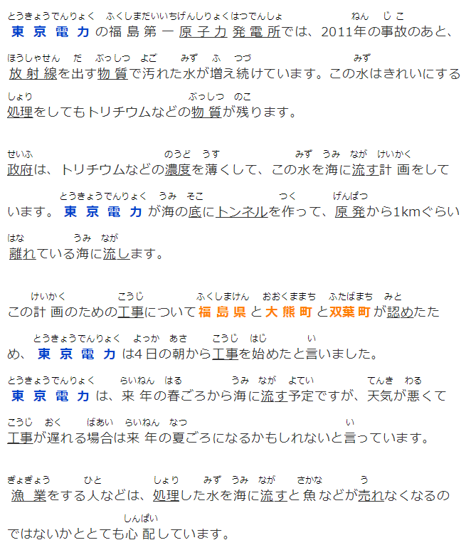 この計画のための工事について福島県と大熊町と双葉町が認めたため、東京電力は4日の朝から工事を始めたと言いました。東京電力は、来年の春ごろから海に流す予定ですが、天気が悪くて工事が遅れる場合は来年の夏ごろになるかもしれないと言っています。