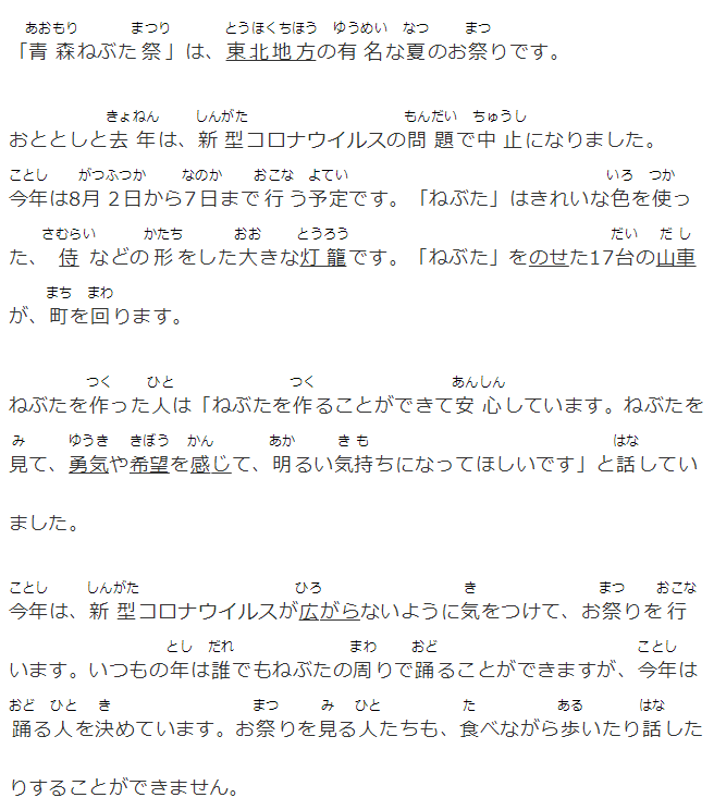 今年は、新型コロナウイルスが広がらないように気をつけて、お祭りを行います。いつもの年は誰でもねぶたの周りで踊ることができますが、今年は踊る人を決めています。お祭りを見る人たちも、食べながら歩いたり話したりすることができません。
