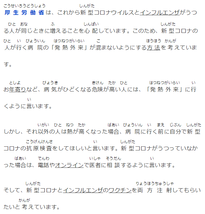 厚生労働省は、これから新型コロナウイルスとインフルエンザがうつる人が同じときに増えることを心配しています。このため、新型コロナの人が行く病院の「発熱外来」が混まないようにする方法を考えています。