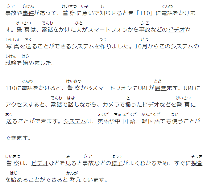事故や事件があって、警察に急いで知らせるとき「110」に電話をかけます。警察は、電話をかけた人がスマートフォンから事故などのビデオや写真を送ることができるシステムを作りました。10月からこのシステムの試験を始めました。